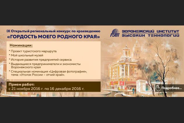 С 21 ноября в ВИВТ стартовал ежегодный IX открытый региональный конкурс по краеведению «Гордость моего родного края». Конкурс учрежден в 2008 году Воронежским институтом высоких технологий c целью создания благоприятных условий для развития у детей творческих и интеллектуальных способностей, интереса к научно-исследовательской деятельности; создания необходимых условий для поддержки одаренных детей; повышения интереса к различным видам туристско- краеведческой деятельности.
