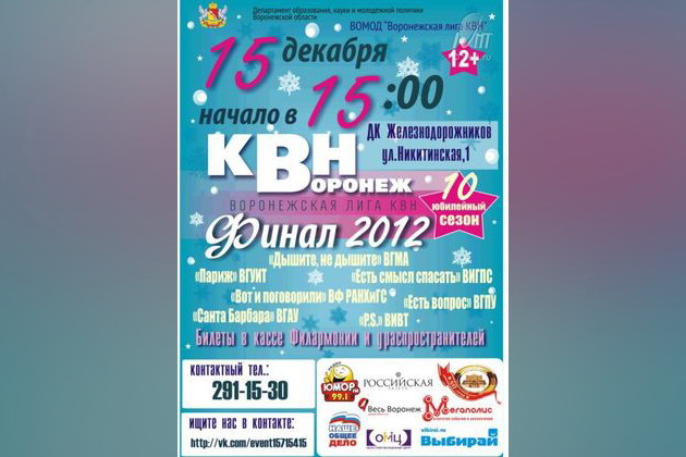 Финал десятого юбилейного сезона Воронежской лиги КВН прошел в субботу, 15 декабря, во Дворце культуры железнодорожников. Турнир организовали: Воронежское областное молодежное общественное движение «Воронежская лига КВН» совместно с департаментом образования, науки и молодежной политики Воронежской области и государственным учреждением «Областной молодежный центр».